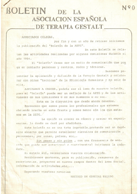 El origen de la Revista de Terapia Gestalt se remonta al Boletín de la AETG, cuyo primer número vio la luz en noviembre de 1984 como vehículo de comunicación interna y plataforma para compartir experiencias y contenidos afines. Durante dos décadas, el boletín mantuvo un formato sencillo y